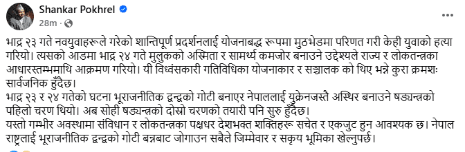 महासचिव पोखरेलले भाद्र २३ गते नवयुवाहरूले गरेको शान्तिपूर्ण प्रदर्शनलाई योजनाबद्ध रूपमा मुठभेडमा परिणत गरी केही युवाको हत्या गरिएको त्यसको आडमा भदौ २४ गते मुलुकको अस्मिता र सामर्थ्य कमजोर बनाउने उद्देश्यले राज्य र लोकतन्त्रका आधार स्तम्भमाथि आक्रमण गरिएको समेत आरोप लगाएका छन् ।