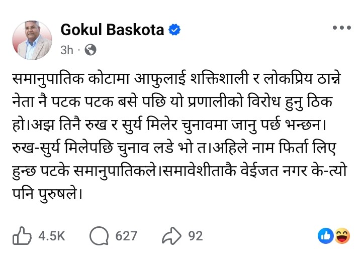 सामाजिक सञ्जालमार्फत उनले लेखेका छन्– समानुपातिक कोटामा आफूलाई शक्तिशाली र लोकप्रिय ठान्ने नेता नै पटक पटक बसे पछि यो प्रणालीको विरोध हुनु ठिक हो।अझ तिनै रुख र सूर्य मिलेर चुनावमा जानु पर्छ भन्छन् ।रुख–सूर्य मिलेपछि चुनाव लडे भो त।अहिले नाम फिर्ता लिए हुन्छ पटके समानुपातिकले।समावेशीताकै वेईजत नगर के–त्यो पनि पुरुषले।
