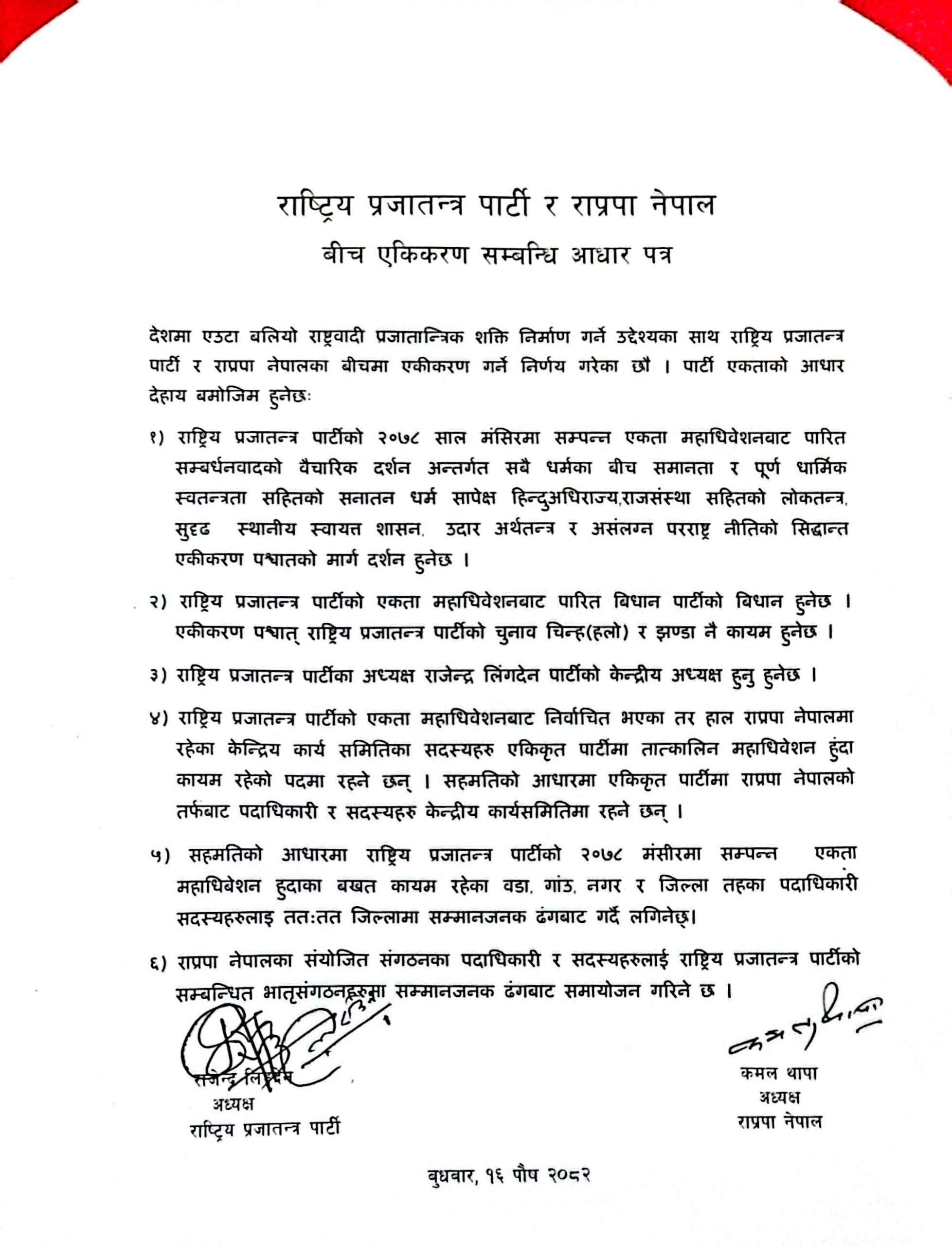 यसअघि पुस ९ गते धुम्बाराहीस्थित राप्रपा केन्द्रीय कार्यालयमा दुवै नेताले एकताको समझदारीपत्रमा हस्ताक्षर गरेका थिए ।