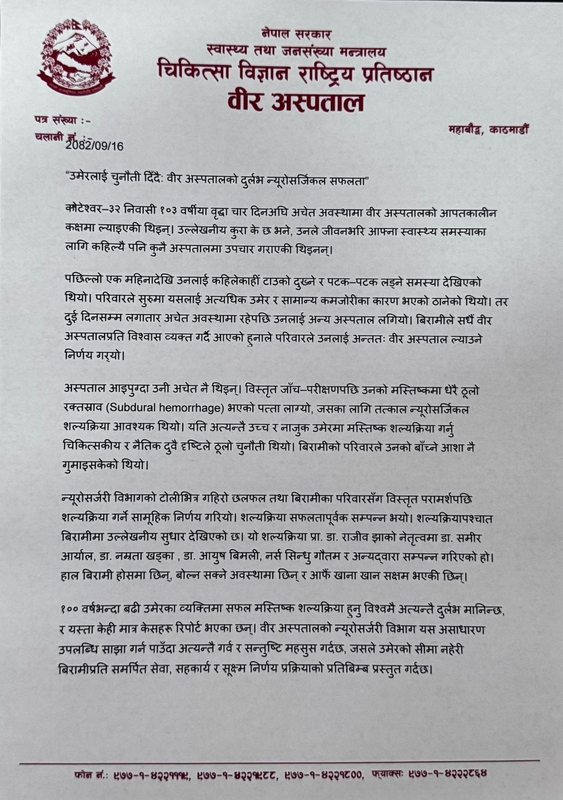 १०० वर्षभन्दा बढी उमेरका व्यक्तिमा सफल मस्तिष्क शल्यक्रिया हुनु विश्वमै अत्यन्तै दुर्लभ मानिन्छ।