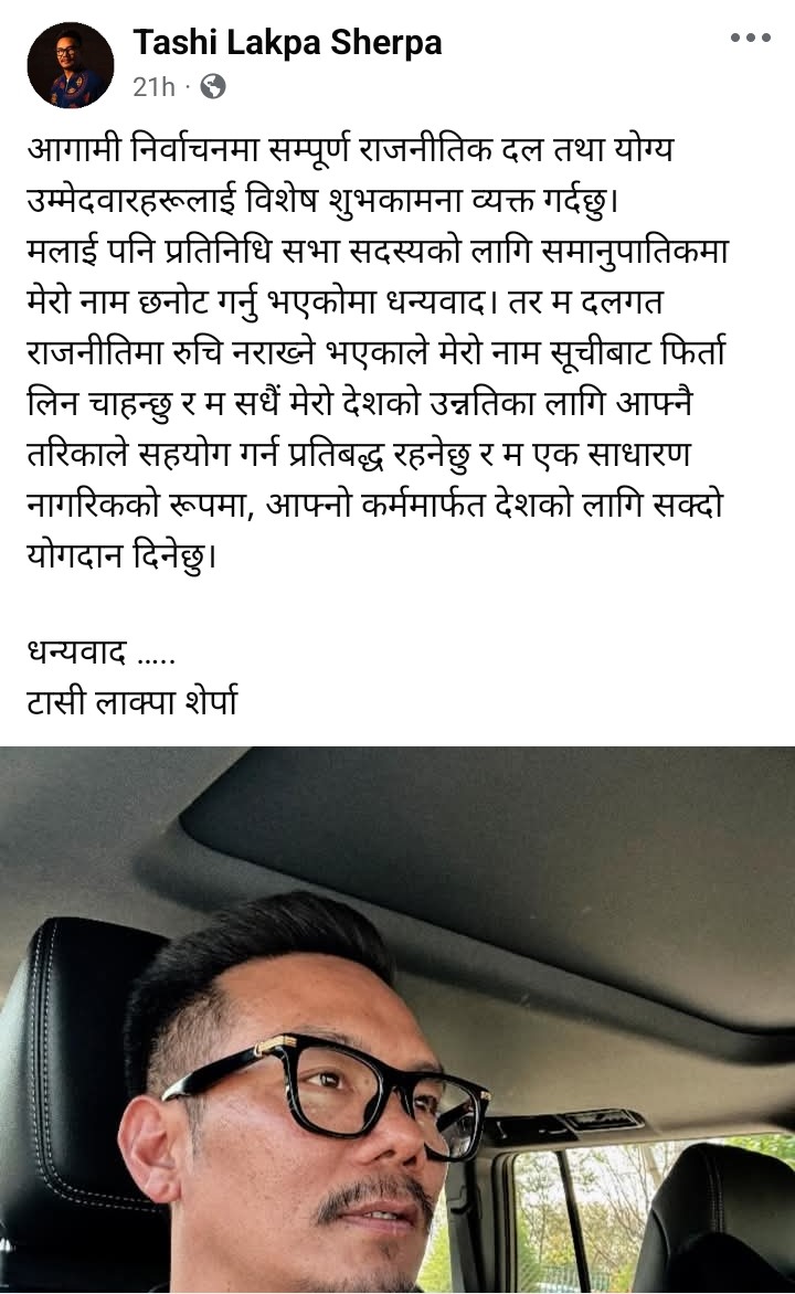 फोर्टिन पिक्स एक्सिपिडिसनका सीईओ टासीले सामाजिक सञ्जाल फेसबुकमा स्टाटस लेखेर दलगत राजनीतिमा रुचि नराख्ने बताएका छन् । उनले लेखेका छन्, ‘मलाई पनि प्रतिनिधि सभा सदस्यको लागि समानुपातिकमा मेरो नाम छनोट गर्नु भएकोमा धन्यवाद । तर म दलगत राजनीतिमा रुचि नराख्ने भएकाले मेरो नाम सूचीबाट फिर्ता लिन चाहन्छु ।’