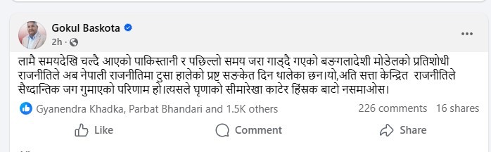 ‘लामै समयदेखि चल्दै आएको पाकिस्तानी र पछिल्लो समय जरा गाड्दै गएको बंगलादेशी मोडेलको प्रतिशोधी राजनीतिले अब नेपाली राजनीतिमा टुसा हालेको प्रस्ट संकेत दिन थालेका छन्,’ उनले फेसबुकमा लेखेका छन्, ‘योअति सत्ता केन्द्रित राजनीतिले सैद्धान्तिक जग गुमाएको परिणाम हो। त्यसले घृणाको सीमारेखा काटेर हिंस्रक बाटो नसमाओस् ।