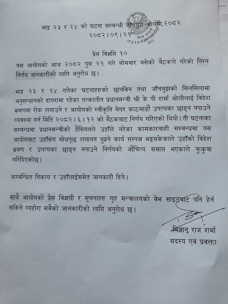 ओलीमाथि गत असोज १२ गतेको आयोगको बैठकले स्थान हद लगाउने निर्णय गरेको थियो । जेनजी आन्दोलनको सम्बन्धमा तत्कालीन प्रधानमन्त्रीको हैसियतमा गरेका कामकारबाहीको सम्बन्धमा सोधपुछको काम सकिएकोले उनको विदेश भ्रमण रोक्का र उपत्यका छाड्न नपाउने निर्णयको औचित्य सम्पन्न भइसकेकोले फुकुवा गरिदिएको शर्माले जारी विज्ञप्तिमा उल्लेख छ ।