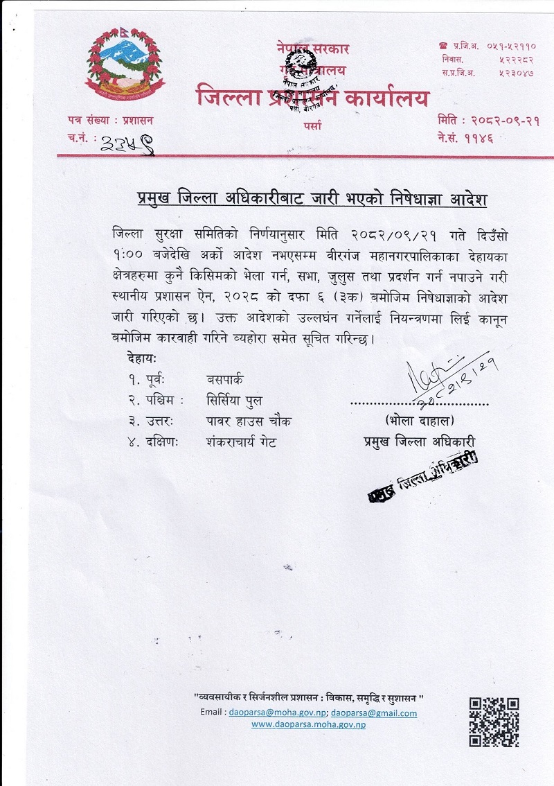 पर्साका प्रमुख जिल्ला अधिकारी भोला दाहालले जारी गर्नुभएको सूचनामा वीरगञ्ज महानगरपालिका क्षेत्रअन्तर्गत पूर्वमा बसपार्क, पश्चिममा सिर्सिया पुल, उत्तरमा पावर हाउस चोक र दक्षिणमा शङ्कराचार्य गेटसम्म कुनै किसिमको भेला गर्न, सभा, जुलुस तथा प्रदर्शन गर्न नपाउने उल्लेख छ ।