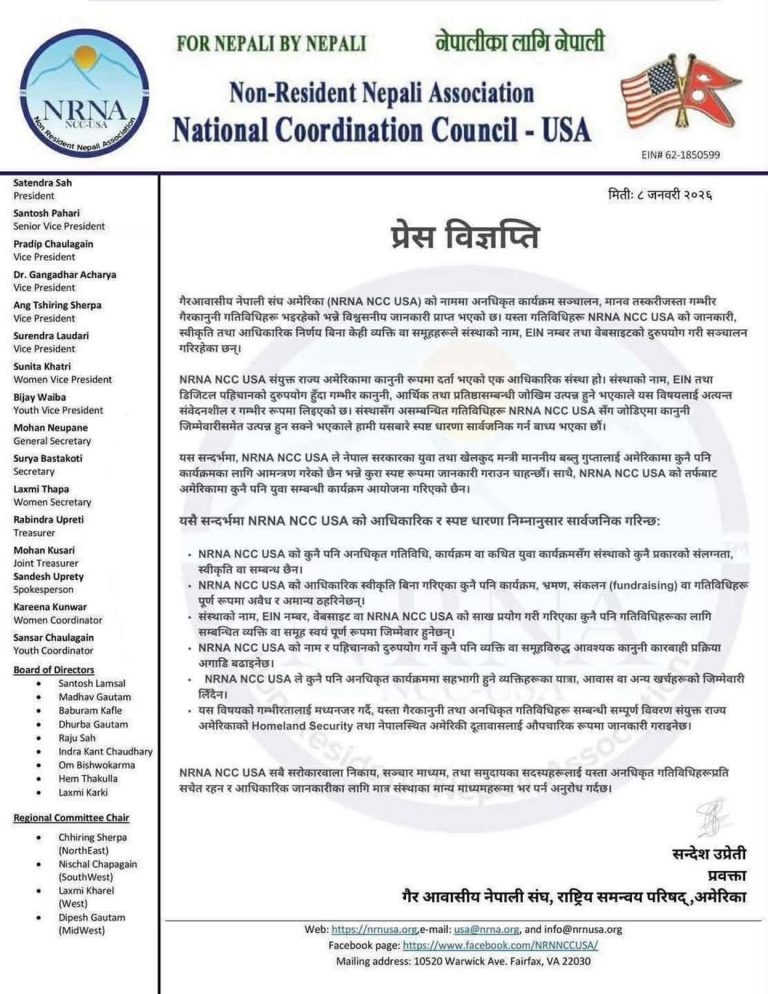एनआरएनए एनसीसी यूएसएको नाम र आधिकारिक वेबसाइटको दुरुपयोग गरी अनधिकृत कार्यक्रम संचालन भइरहेको र यससँग मानव तस्करी जस्ता गम्भीर गैरकानुनी गतिविधिसमेत जोडिएको विश्वासयोग्य जानकारी प्राप्त भएको विज्ञप्तीमा उल्लेख छ ।