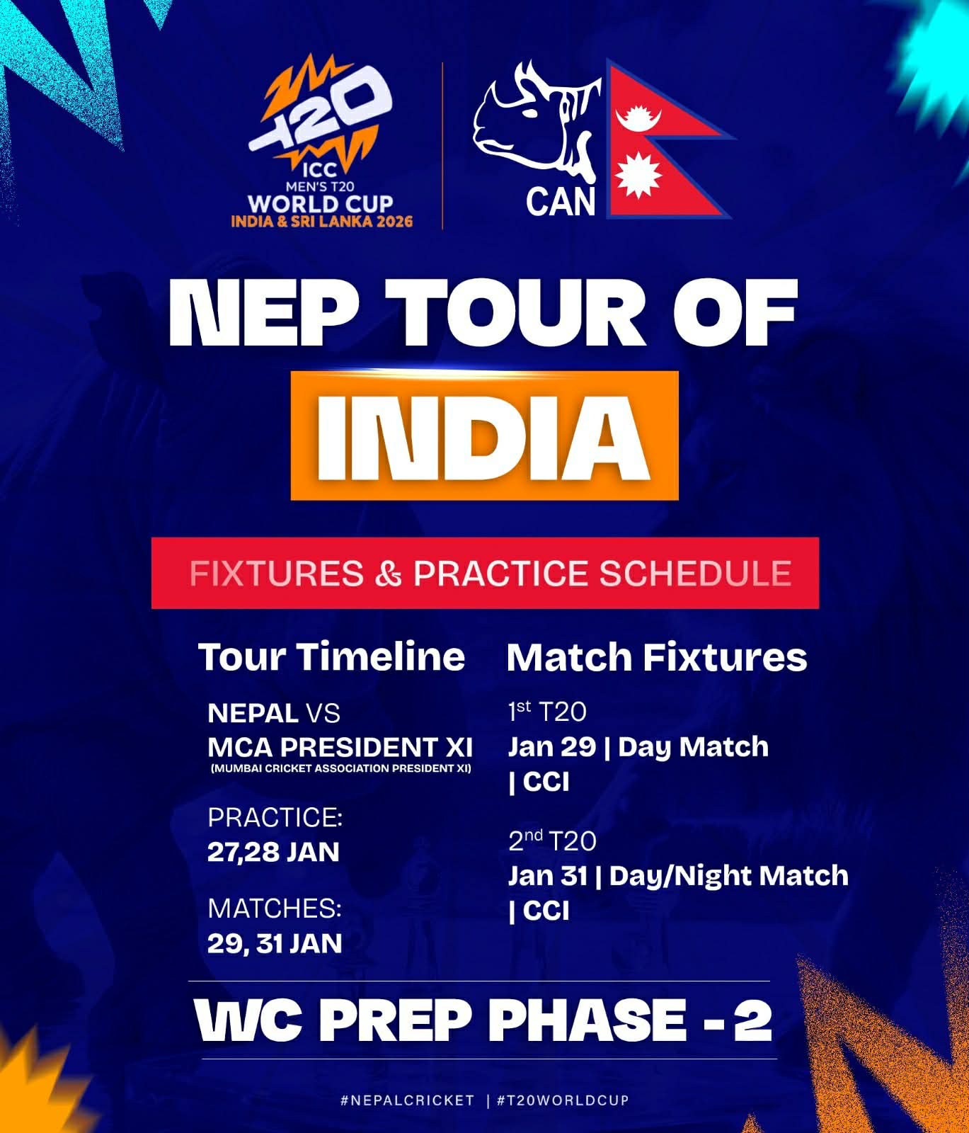 दोस्रो चरणमा भारतमा प्रशीक्षण र अभ्यास खेल खेल्नेछ। टोलीले मुम्बई क्रिकेट एशोसियसन प्रेसिडेन्ट ११ सँग अभ्यास खेल खेल्नेछ। नेपली टोलीले जनवरी २७ र २८ मा अभ्यास गर्नेछ। जनवरी २९ र ३१ मा अभ्यास खेल खेल्ने तालिका रहेको छ।