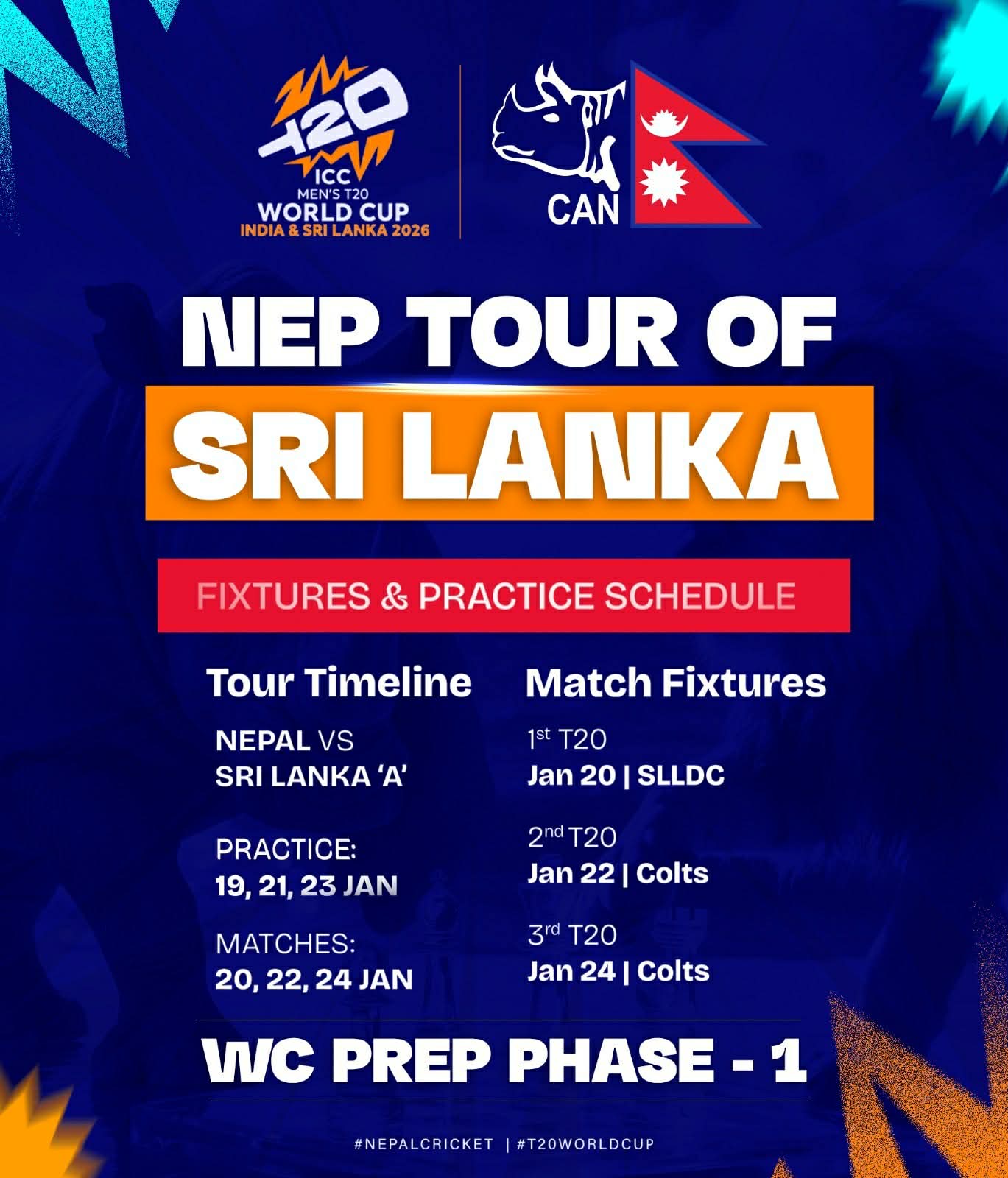 नेपाली टोलीले पहिलो चरणमा श्रीलंकाको ए टोली र स्थानिय टोलीसँग अभ्यास खेल्नेछ। नेपालले जनवरी १९,२१ र २३ मा अभ्यास गर्नेछ। जनवरी २०,२२ र २४ मा अभ्यास खेल खेल्नेछ।