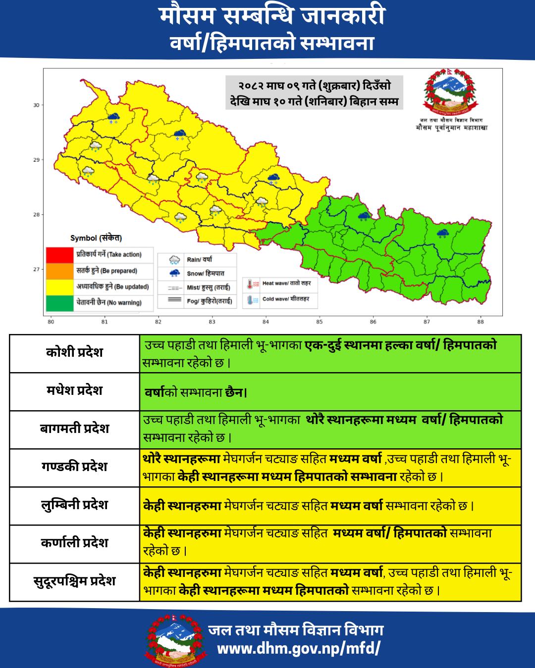 सुदूरपश्चिम प्रदेश केही स्थानहरूमा मेघगर्जन चट्याङसहित मध्यम वर्षा उच्च पहाडी तथा हिमाली भूभागका केही स्थानहरूमा मध्यम हिमपातको सम्भावना रहेको छ ।
