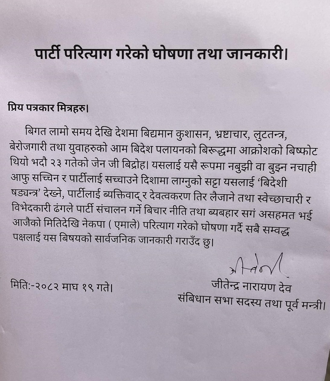 जेनजी आन्दोलनको सन्दर्भ निकाल्दै देवले भनेका छन्, ‘आफू सच्चिन र पार्टीलाई सच्चाउने दिशमा लाग्नुको सट्टा यसलाई विदेशी षड्यन्त्र देख्ने, पार्टीलाई व्यक्तिवाद र देवत्वकरणतिर लैजाने तथा स्वेच्छाचारी र विभेदकारी ढंगले पार्टी सञ्चालन गर्ने विचार नीति तथा व्यवहारसँग असहमत भई आजैको मितिदेखि नेकपा (एमाले) परित्याग गरेको घोषणा गर्दै सम्बद्ध पक्षलाई यस विषयको सार्वजनिक जानकारी गराउँदछु।’