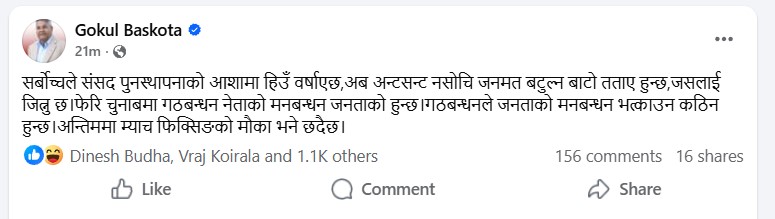 ‘सर्वोच्चले संसद् पुनःस्थापनाको आशामा हिउँ वर्षाएछ,’ उनले सामाजिक सञ्जालमा लेखेका छन्, ‘अब अन्टसन्ट नसोचि जनमत बटुल्न बाटो तताए हुन्छ, जसलाई जित्नु छ। फेरि चुनावमा गठबन्धन नेताको, मनबन्धन जनताको हुन्छ। गठबन्धनले जनताको मनबन्धन भत्काउन कठिन हुन्छ। अन्तिममा म्याच फिक्सिङको मौका भने छँदैछ ।