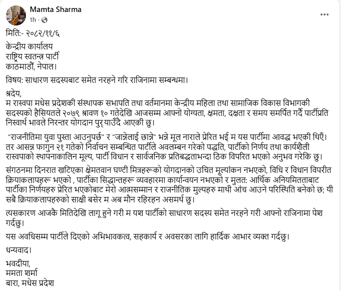 ‘राजनीतिमा युवा पुस्ता आउनुपर्छ र जान्नेलाई छान्ने भन्ने मूल नाराले प्रेरित भई म यस पार्टीमा आबद्ध भएकी थिएँ। तर आसन्न फागुन २१ गतेको निर्वाचन सम्बन्धित पार्टीले अवलम्बन गरेको पद्धति, पार्टीको निर्णय तथा कार्यशैली रास्वपाको स्थापनाकालीन मूल्य, पार्टी विधान र सार्वजनिक प्रतिबद्धताभन्दा ठिकविपरीत भएको अनुभव गरेको छु। संगठनमा दिनरात खटिएका क्षेमतवान घण्टी मित्रहरूको योगदानको उचित मूल्यांकन नभएको, विधि र विधानविपरीत क्रियाकलापहरू भएको, पार्टीका सिद्धान्तहरू व्यवहारमा कार्यान्वयन नभएको र मूलतस् आर्थिक अनियमितताबाट पार्टीका निर्णयहरू प्रेरित भएकोबाट मेरो आत्मसम्मान र राजनीतिक मूल्यहरूमाथि आँच आउने परिस्थिति बनेको छस यी सबै क्रियाकलापहरूको साक्षी बसेर म अब मौन रहिरहन असमर्थ छु’, बुधबार बिहान विज्ञप्ति जारी गरी शर्माले भनेकी छन्, ‘त्यसकारण आजकै मितिदेखि लागु हुने गरी म यस पार्टीको साधारण सदस्यसमेत नरहने गरी आफ्नो राजीनामा पेस गर्दछु।