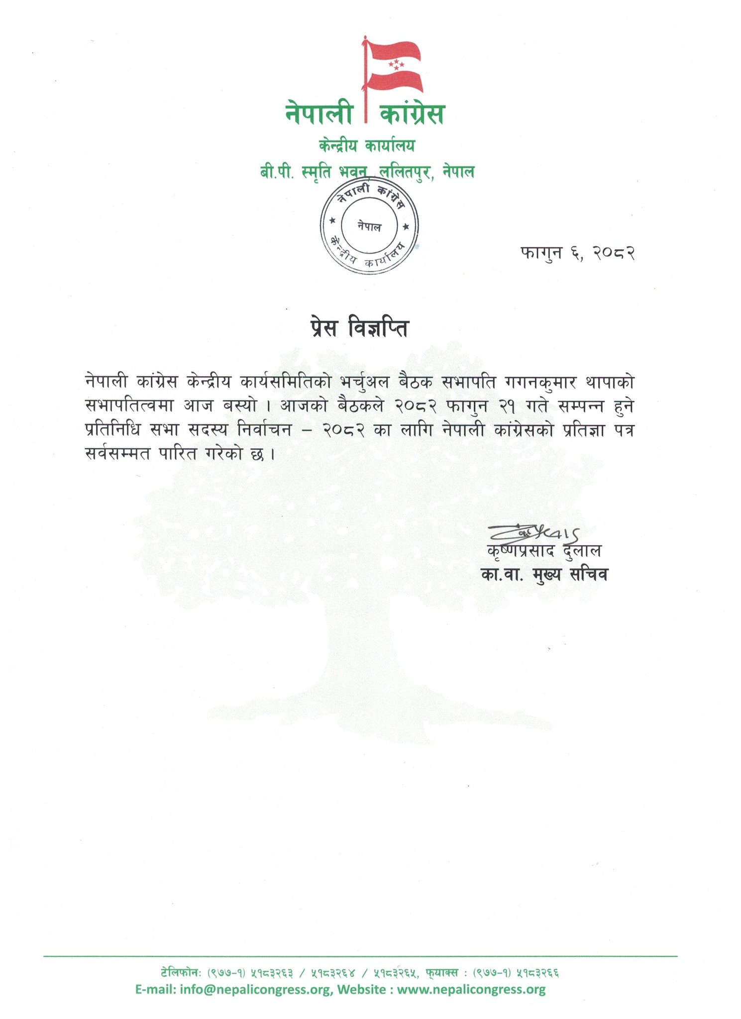 बैठकले फागुन २१ गते हुने प्रतिनिधिसभा सदस्य निर्वाचन–२०८२ का लागि नेपाली कांग्रेसको प्रतिज्ञा–पत्र सर्वसम्मत पारित गरेको हो । यसअघि घोषणापत्र भन्दै आएको कांग्रेसले यसपटक प्रतिज्ञा–पत्र भनेको छ ।