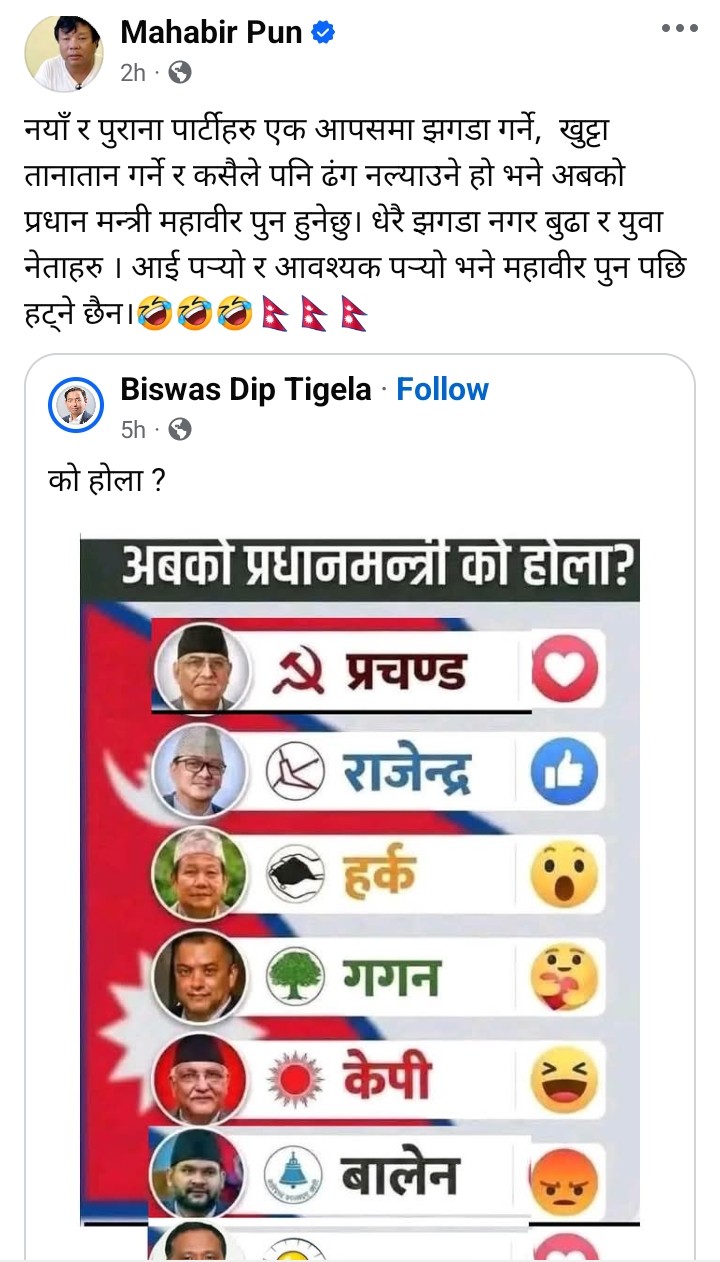 उनी सामाजिक सञ्जालमा लेख्छन्, ‘नयाँ र पुराना पार्टीहरू एकआपसमा झगडा गर्ने, खुट्टा तानातान गर्ने र कसैले पनि ढंग नल्याउने हो भने अबको प्रधानमन्त्री महावीर पुन हुनेछु। धेरै झगडा नगर बुढा र युवा नेताहरू। आइपऱ्यो र आवश्यक पऱ्यो भने महावीर पुन पछि हट्ने छैन।’