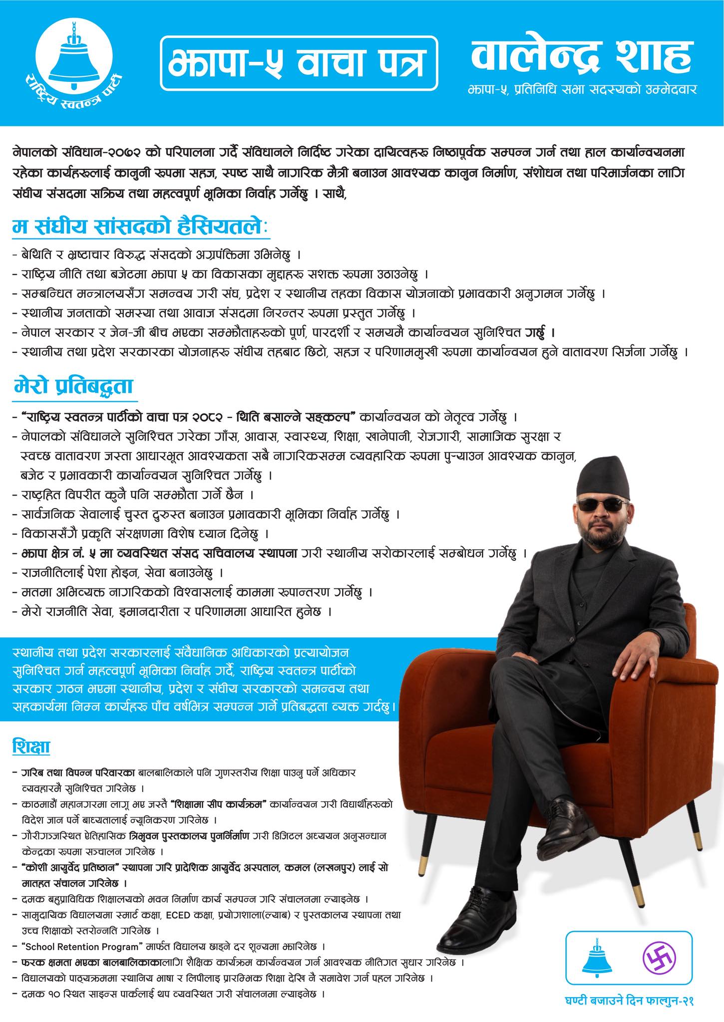 रास्वपाबाट झापा ५ मा उम्मेदवार रहेका शाहले आफ्नो बाचापत्र सार्वजनिक गरेका हुन्।