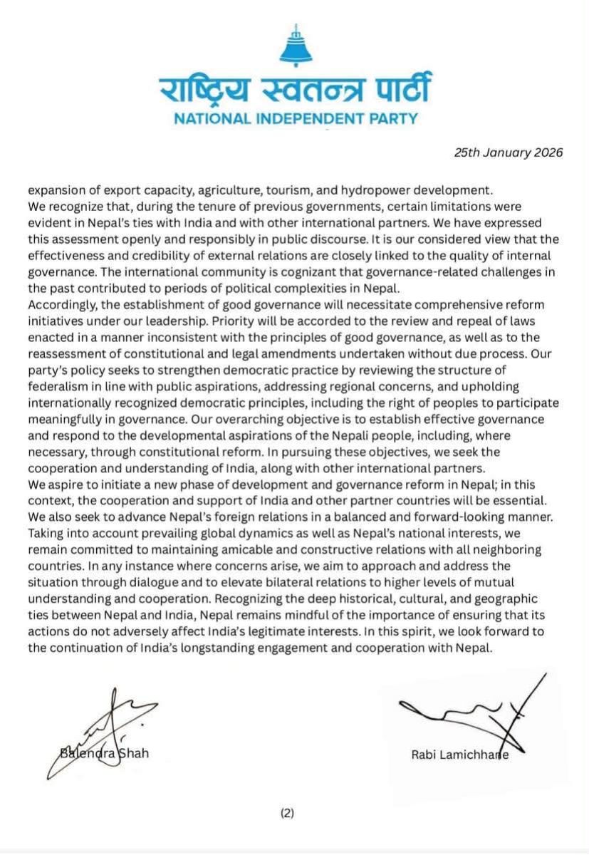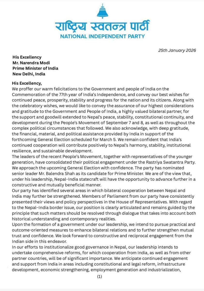 अरू सबैलाई खराब, भ्रष्ट, विदेशी दलाल भन्दै आएको सो पार्टीले दुई जनाको संयुक्त हस्ताक्षरमा पठाएको पत्रमा जेनजी आन्दोलनपछि प्राप्त सहयोगको प्रसंग कोट्याउँदै अबको चुनावमा पनि सोही किसिमको सदाशयता प्राप्त हुने दृढ विश्वास व्यक्त गरिएको छ उल्लेख छ।