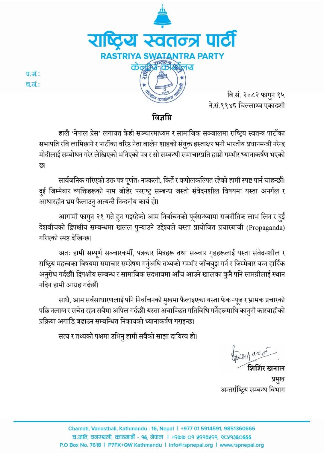 काठमाडौँ । राष्ट्रिय स्वतन्त्र पार्टीका सभापति रवि लामिछाने र वरिष्ठ नेता बालेन शाहको नाम जोडेर भारतीय प्रधानमन्त्री नरेन्द्र मोदिलाई पठाइएको भनिएको पत्र पूर्ण रूपमा नक्कली भएको रास्वपाले दाबी गरेको छ ।
