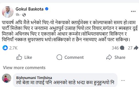 बास्कोटाले सामाजिक सञ्जाल फेसबुकमा लेख्दै ५ वर्षअघि आफूले नेकपाको ‘क्लाइमेक्स र कोल्याप्स’को समय भएको बताएका थिए।