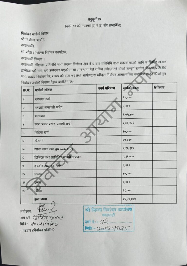 उनले फागुन २१ मा सम्पन्न निर्वाचनको क्रममा १५ लाख २३ हजार ४३७ रुपैयाँ खर्च भएको विवरण पेस गरेका हुन् ।