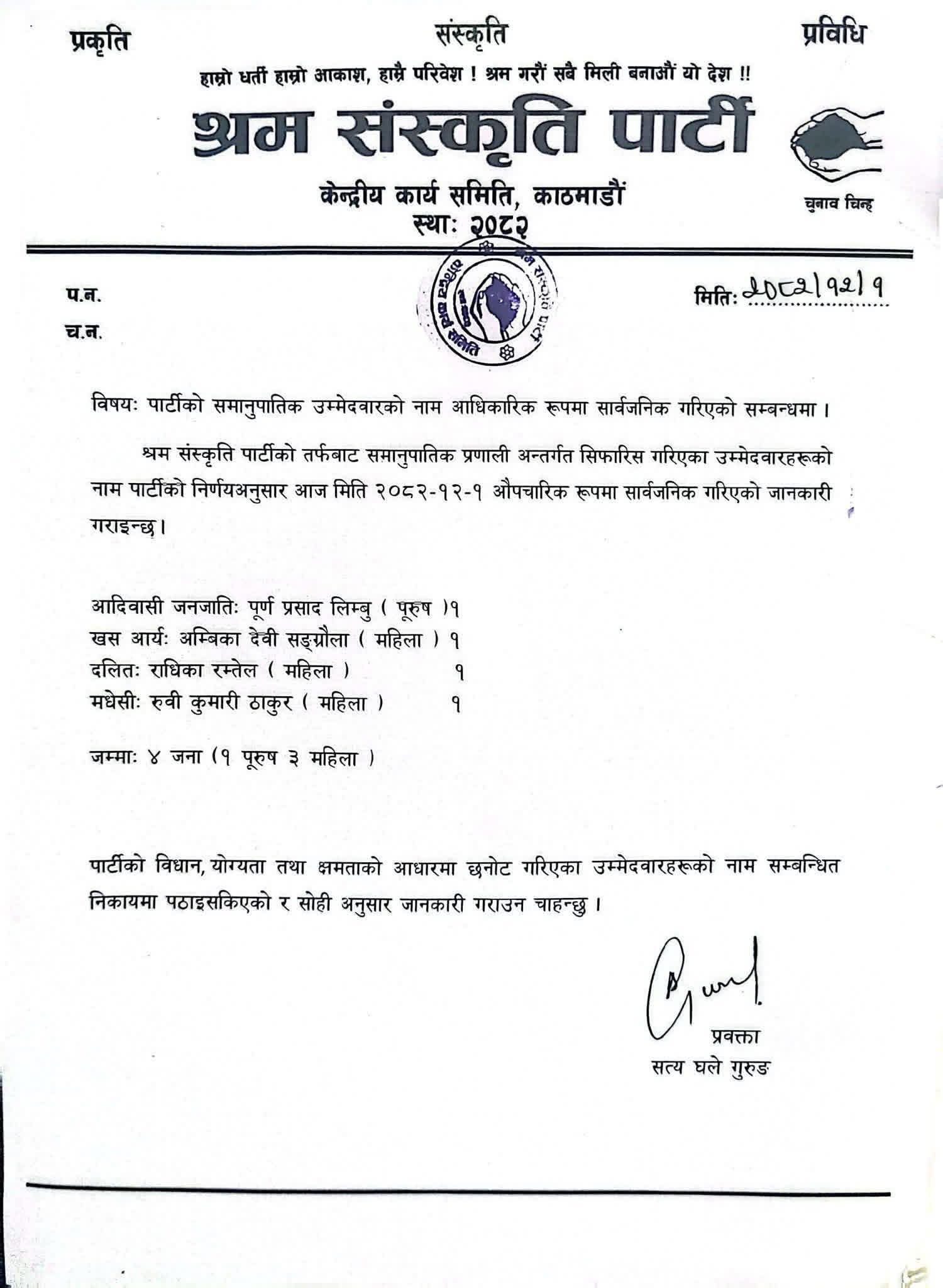 काठमाडौ । श्रम संस्कृति पार्टीले समानुपातिक सांसदको नाम टुंगो लगाएको छ । श्रम संस्कृतिले आइतबार ९चैत १० एक पुरुष र तीन महिलाको नाम निर्वाचन आयोगमा सिफारिस गरेको हो ।