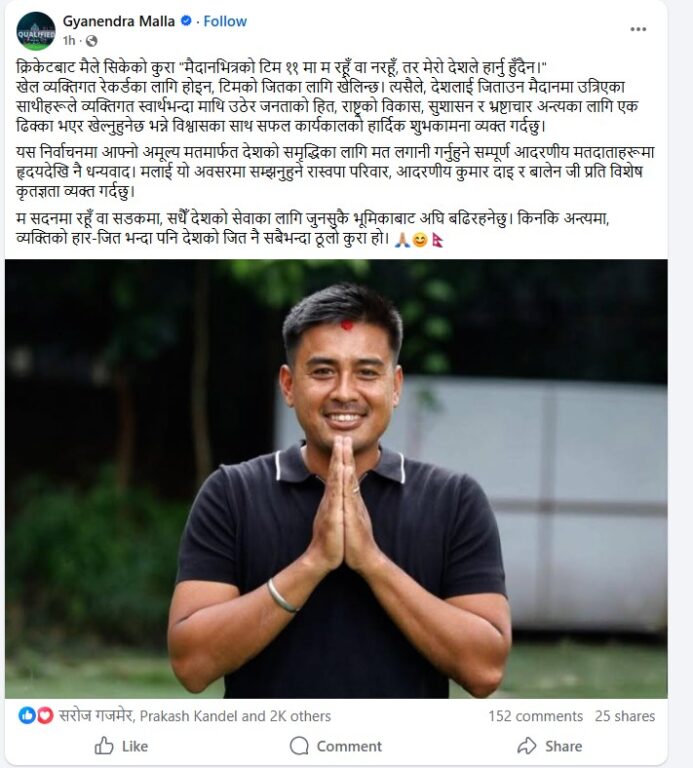 ‘क्रिकेटबाट मैले सिकेको कुरा, मैदानभित्रको टिम ११ मा म रहूँ वा नरहूँ तर मेरो देशले हार्नु हुँदैन,’ उनले सामाजिक सञ्जालमा लेखेका छन्, ‘खेल व्यक्तिगत रेकर्डका लागि होइन, टिमको जितका लागि खेलिन्छ। त्यसैले, देशलाई जिताउन मैदानमा उत्रिएका साथीहरूले व्यक्तिगत स्वार्थभन्दा माथि उठेर जनताको हित, राष्ट्रको विकास, सुशासन र भ्रष्टाचार अन्त्यका लागि एक ढिक्का भएर खेल्नुहुनेछ भन्ने विश्वासका साथ सफल कार्यकालको हार्दिक शुभकामना व्यक्त गर्दछु।’