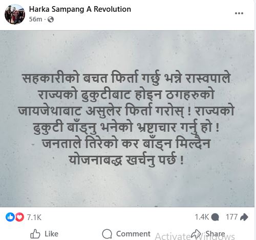उनले सामाजिक सञ्जालमा लेख्छन्, राज्यको ढुकुटी बाँड्नु भनेको भ्रष्टाचार गर्नु हो ! जनताले तिरेको कर बाँड्न मिल्दैन योजनाबद्ध खर्चनु पर्छ !
