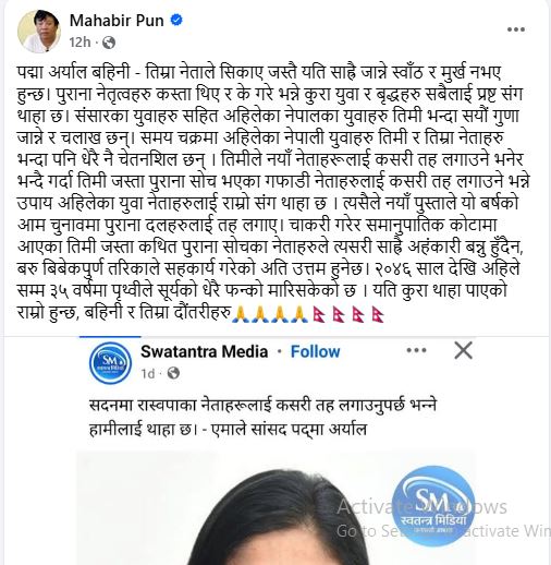 पुनले सामाजिक सञ्जालमार्फत प्रतिक्रिया दिँदै पुराना दलका नेताहरूलाई ‘अहङ्कारी’ र ‘यथार्थबाट टाढा’ भएको आरोप लगाए । “आफ्ना नेताले सिकाएजस्तो स्वाँठ र मूर्ख नबन्नू,” भन्दै उनले पद्मा अर्यालमाथि सीधा प्रहार गरेका छन्।