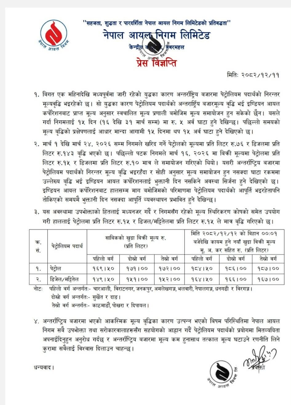 निगमले मध्यपूर्वमा जारी युद्धका कारण अन्तर्राष्ट्रिय बजारमा पेट्रोलियम पदार्थको निरन्तर मूल्यवृद्धि भइरहेको जनाएको छ।