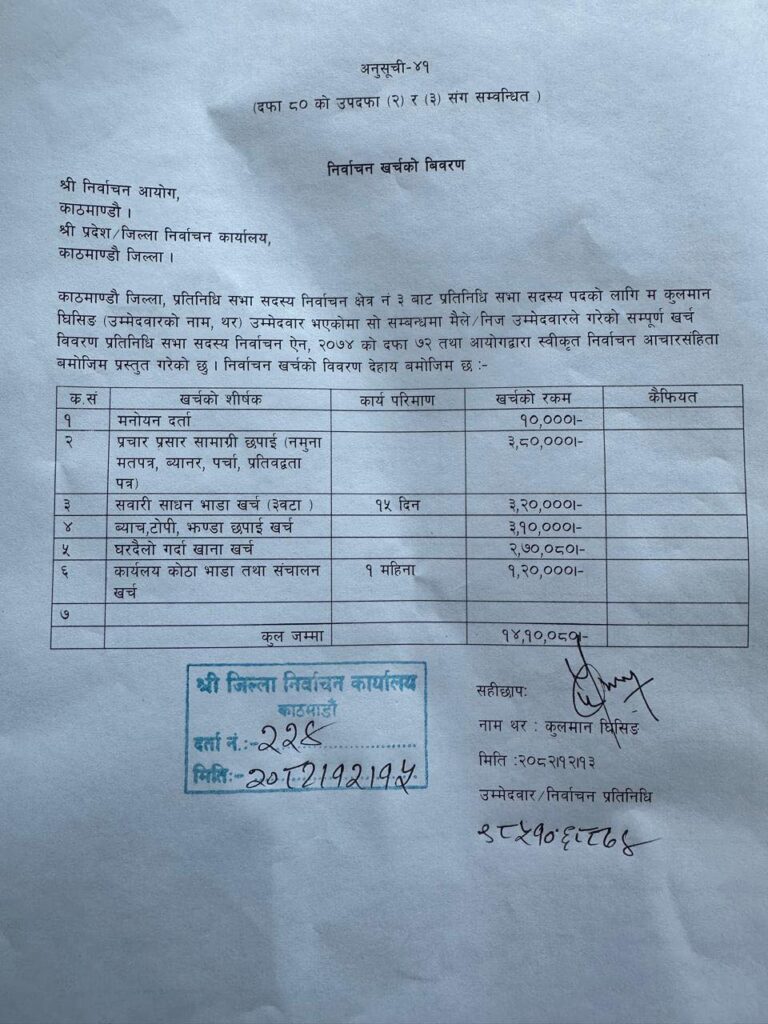 काठमाडौं । उज्यालो नेपाल पार्टीका अध्यक्ष कुलमान घिसिङले आफ्नो चुनावी खर्च बिवरण सार्वजनिक गरेका छन् । गत फागुन २१ को प्रतिनिधिसभाको चुनावमा घिसिङले काठमाडौं क्षेत्र नं ३ बाट उम्मेदवारी दिएका थिए।