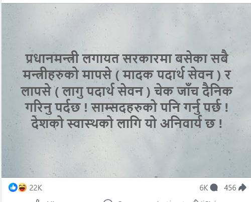 उनले लेखेका छन्, प्रधानमन्त्री लगायत सरकारमा बसेका सबै मन्त्रीहरुको मापसे र लापसे चेक जाँच दैनिक गरिनु पर्दछ १ साम्सदहरुको पनि गर्नु पर्छ ! देशको स्वास्थको लागि यो अनिवार्य छ ।