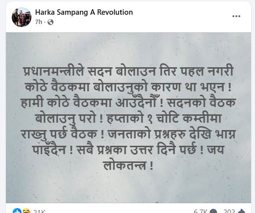 उनले सोमबार सामाजिक सञ्जालमार्फत लेखेका छन्,‘प्रधानमन्त्रीले सदन बोलाउनतिर पहल नगरी कोठे बैठकमा बोलाउनुको कारण थाहा भएन। हामी कोठे बैठकमा आउँदैनौँ। सदनको बैठक बोलाउनु पर्यो। हप्ताको एकचोटी कम्तिमा राख्नुपर्छ बैठक।’