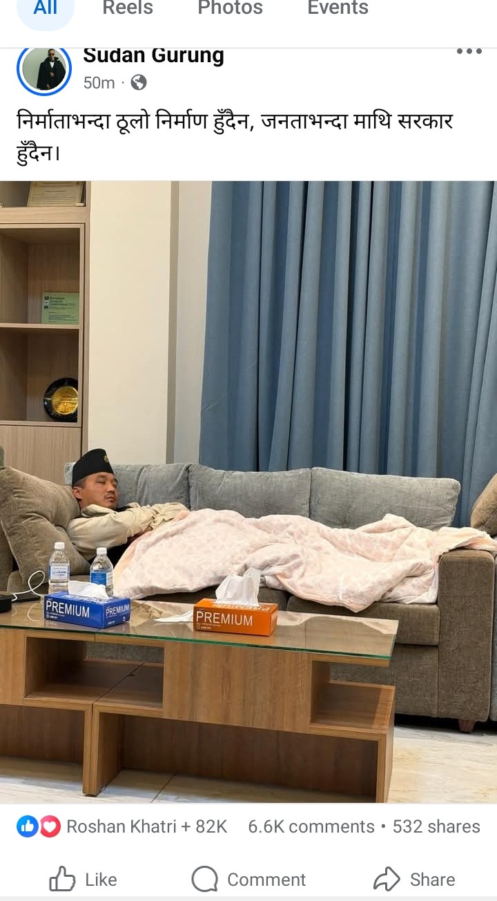 मन्त्रालयकाे सोफामा सुतिरहेको तस्बिर सार्वजनिक गर्दै गृहमन्त्री गुरुङ लेख्छन् : जनताभन्दा माथि सरकार हुँदैन