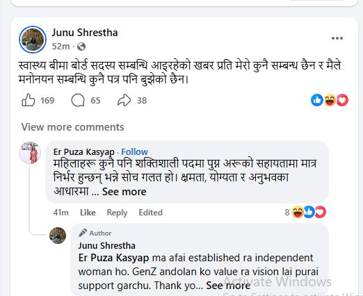 मन्त्री पत्नी जुनुले आज बिहान फेसबुक स्ट्याटस माफर्त स्पष्टिकरण दिँदै बीमा बोर्डमा मनोनयनसम्बन्धी कुनै पनि पत्र आफूले नबुझेको बताएकी हुन् ।