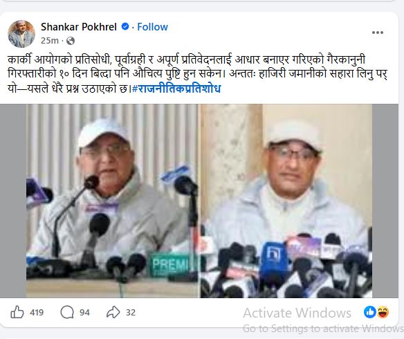 उनले लेखेका छन् कार्की आयोगको प्रतिसोधी, पूर्वाग्रही र अपूर्ण प्रतिवेदनलाई आधार बनाएर गरिएको गैरकानुनी गिरफ्तारीको १० दिन बित्दा पनि औचित्य पुष्टि हुन सकेन। अन्ततः हाजिरी जमानीको सहारा लिनु पर्य-यसले धेरै प्रश्न उठाएको छ।