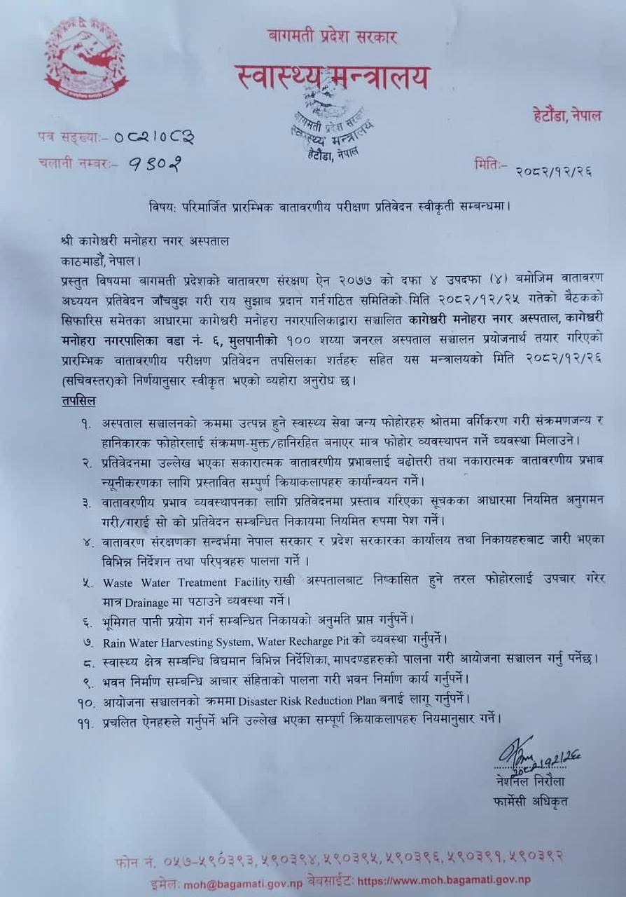 मन्त्रालयले वातावरण संरक्षण ऐन, २०७६ अनुसार तयार गरिएको उक्त प्रतिवेदन समितिको सिफारिसका आधारमा आवश्यक सर्तसहित अनुमोदन गरेको जनाएको छ। स्वीकृतिसँगै अस्पताल सञ्चालनका क्रममा वातावरणीय मापदण्ड कडाइका साथ पालना गर्नुपर्नेछ।