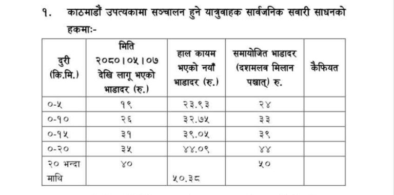 यस्तै, २० किलोमिटरसम्म ४४ रुपैयाँ भाडा निर्धारण गरिएको छ । २० किलोमिटरभन्दा माथिको दूरीका निम्ति ५० रुपैयाँ भाडा कायम गरिएको छ ।