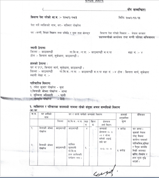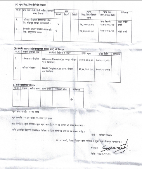 काठमाडौं । शिक्षा, विज्ञान तथा प्रविधिमन्त्री सस्मित पोखरेलले २३ करोड ४१ लाख २७ हजार खुद सम्पत्ति रहेको विवरण बुझाएका छन् ।