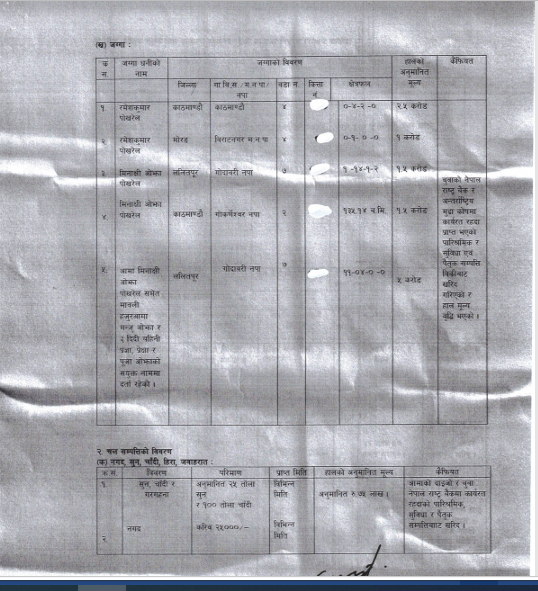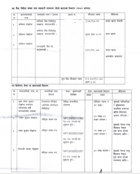 २५ तोला सुन र एक सय तोला चाँदी रहेको पनि उल्लेख छ । सानिमा र एनआईसी एसिया बैंकमा साढे चार लाख नगद रहेको उल्लेख छ । विभिन्न कम्पनीका सेयर र दुईवटा गाडी रहेको पनि विवरणम उल्लेख छ ।