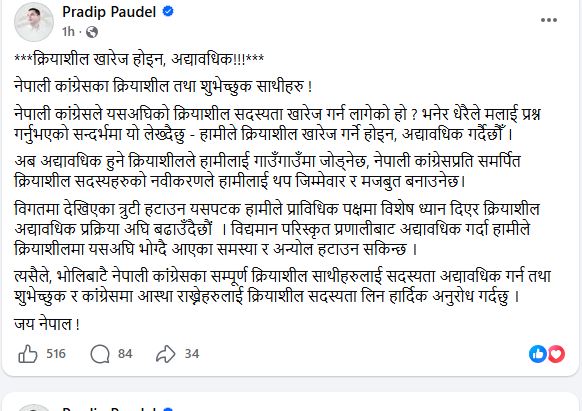 ‘भोलिबाटै नेपाली कांग्रेसका सम्पूर्ण क्रियाशील साथीहरूलाई सदस्यता अद्यावधिक गर्न तथा शुभेच्छुक र कांग्रेसमा आस्था राख्नेहरूलाई क्रियाशील सदस्यता लिन हार्दिक अनुरोध गर्दछु,’ उनले लेखेका छन्।