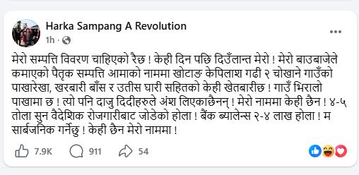 आज सामाजिक सञ्जाल फेसबुकमा स्टाटस लेख्दै उनले आफ्नो नाममा जग्गाजमिन केही नभएको र सामान्य बैंक ब्यालेन्स तथा सुन मात्र रहेको प्रारम्भिक जानकारी दिएका हुन्।