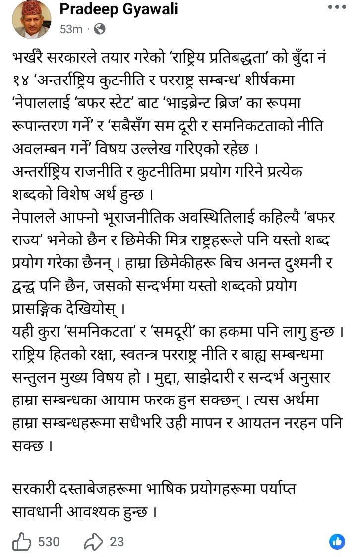 उनले अगाडी लेखेका छन्, ‘राष्ट्रिय हितको रक्षा, स्वतन्त्र परराष्ट्र नीति र बाह्य सम्बन्धमा सन्तुलन मुख्य विषय हो । मुद्दा, साझेदारी र सन्दर्भ अनुसार हाम्रा सम्बन्धका आयाम फरक हुन सक्छन् । त्यस अर्थमा हाम्रा सम्बन्धहरूमा सधैँभर उही मापन र आयतन नरहन पनि सक्छ ।’