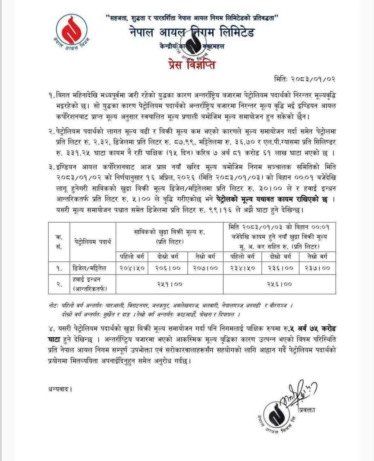यसअनुसार डिजेल र मट्टितेल प्रतिलिटर ३० रुपैयाँ तथा हवाइ इन्धन आन्तरिकतर्फ प्रतिलिटर ५ रुपैयाँ बढेको हो। तर पेट्रोलको भने यथावतु् राखिएको निगमले जनाएको छ।