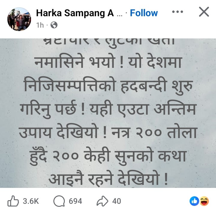 साम्पाङले लेखेका छन, भ्रष्टाचार र लुटको खेती नमासिने भयो ! यो देशमा निजी सम्पत्तिको हदबन्दी शुरु गरिनु पर्छ! यही एउटा अन्तिम उपाय देखियो! नत्र २०० तोला हुँदै २०० केही सुनको कथा आइ नै रहने देखियो !