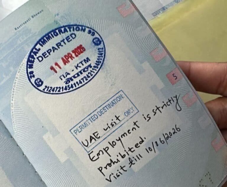 काठमाडौँ। अध्यागमन विभागले भिजिट भिसामा युनाइटेड अरब इमिरेट्स (यूएई) जानेको पासपोर्टमा ‘काम गर्न मनाही’ लेख्नेलाई कारबाही गर्ने भएको छ।