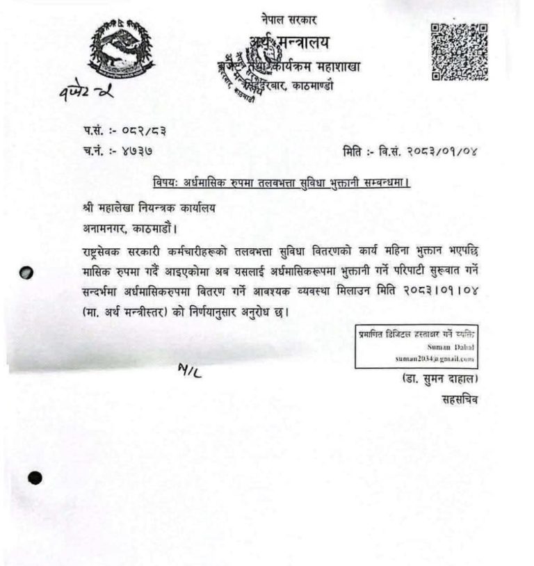अर्थ मन्त्रालयले गत शुक्रबार मन्त्रीस्तरीय निर्णय गरी महालेखा नियन्त्रक कार्यालयलाई समेत निर्णय कार्यान्वयनका लागि परिपत्र गरिसकेको छ ।