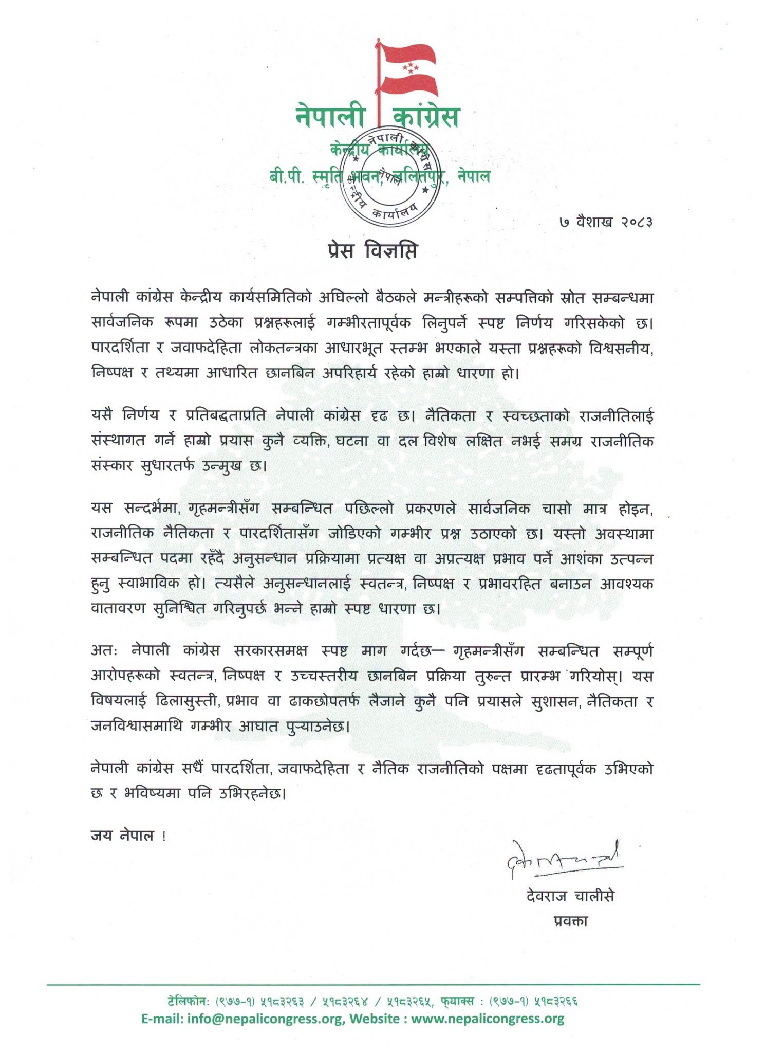 ‘नेपाली कांग्रेस सरकारसमक्ष स्पष्ट माग गर्दछ( गृहमन्त्रीसँग सम्बन्धित सम्पूर्ण आरोपहरूको स्वतन्त्र, निष्पक्ष र उच्चस्तरीय छानबिन प्रक्रिया तुरुन्त प्रारम्भ गरियोस्,’ विज्ञप्तिमा भनिएको छ, ‘यस विषयलाई ढिलासुस्ती, प्रभाव वा ढाकछोपतर्फ लैजाने कुनै पनि प्रयासले सुशासन, नैतिकता र जनविश्वासमाथि गम्भीर आघात पुर्‍याउनेछ।’
