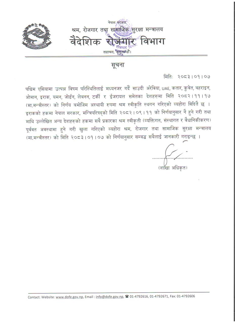 ७ बैशाख, काठमाडौं । सरकारले पश्चिम एसियामा तनाव चलिरहेकै बेला त्यस क्षेत्रका देशमा सबै प्रकारको श्रम स्वीकृति खुल्ला गरेको छ।