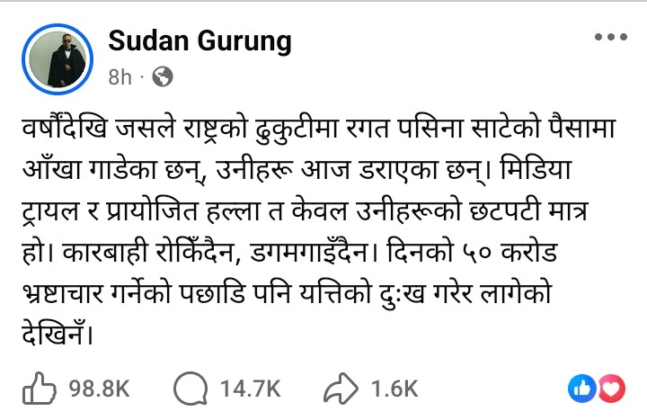 उनले आफ्नाविरुद्ध मिडिया ट्रायल र प्रायोजित हल्ला फैलाइएको जिकिर गर्दै लेखेका छन्, कारबाही रोकिँदैन, डगमगाइँदैन । गुरुङले अगाडि भनेका छन्, दिनको ५० करोड भ्रष्टाचार गर्नेको पछाडि पनि यत्तिको दुःख गरेर लागेको देखिनँ।