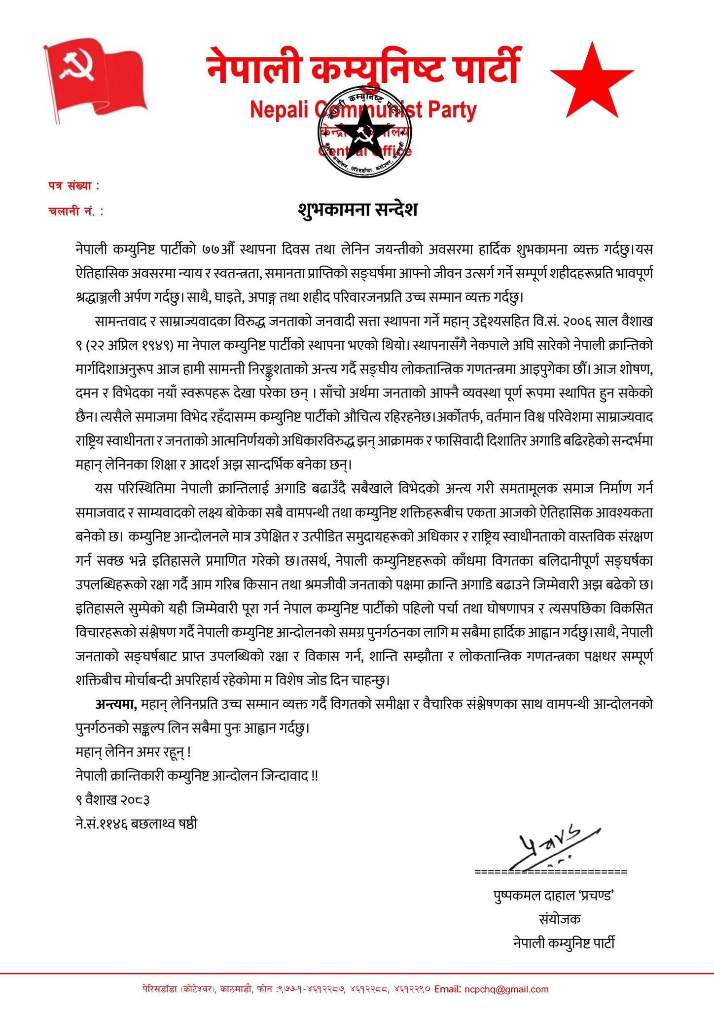‘स्थापनासँगै नेकपाले अघि सारेको नेपाली क्रान्तिको मार्गदिशाअनुरूप आज हामी सामन्ती निरङ्कुशताको अन्त्य गर्दै सङ्घीय लोकतान्त्रिक गणतन्त्रमा आइपुगेका छौँ। आज शोषण, दमन र विभेदका नयाँ स्वरूपहरू देखा परेका छन्,’ प्रचण्डले जारी गरको शुभकामना सन्देशमा भनिएको, ‘साँचो अर्थमा जनताको आफ्नै व्यवस्था पूर्ण रूपमा स्थापित हुन सकेको छैन। त्यसैले समाजमा विभेद रहँदासम्म कम्युनिष्ट पार्टीको औचित्य रहिरहनेछ। अर्कोतर्फ, वर्तमान विश्व परिवेशमा साम्राज्यवाद राष्ट्रिय स्वाधीनता र जनताको आत्मनिर्णयको अधिकारविरुद्ध झन् आक्रामक र फासिवादी दिशातिर अगाडि बढिरहेको सन्दर्भमा महान् लेनिनका शिक्षा र आदर्श अझ सान्दर्भिक बनेका छन्।’