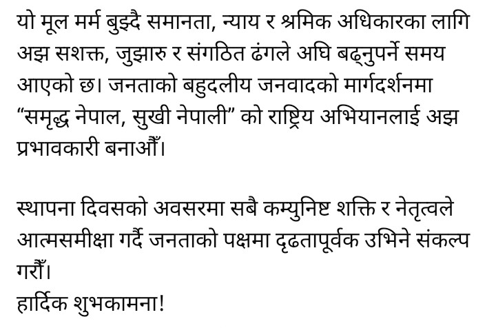 नेपाल कम्युनिष्ट पार्टीको ७७ औँ स्थापना दिवसको अवसरमा शुभकामना सन्देश जारी गर्दै उनले वर्तमान सत्ता समीकरणले जनताको अपेक्षा पूरा गर्नुको साटो निराशा मात्र बढाएको बताएका हुन् ।
