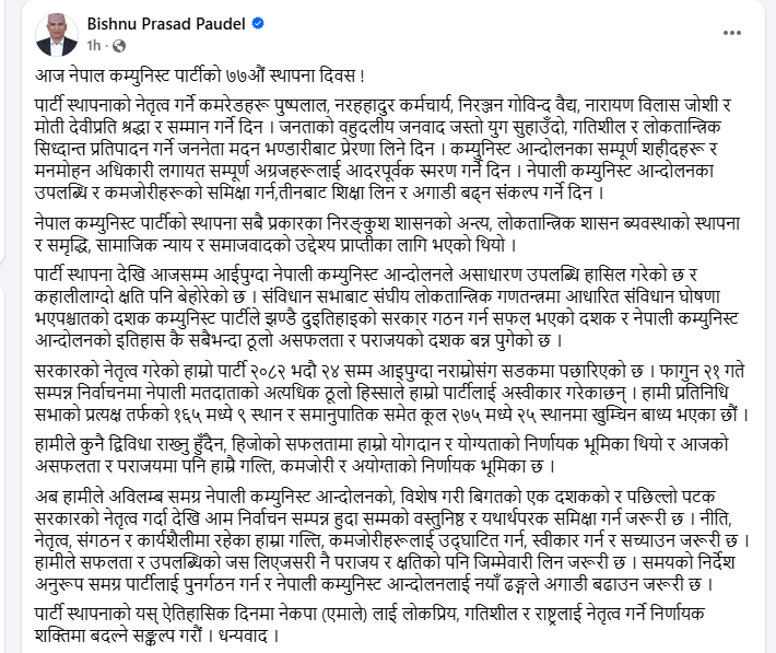 ‘आज नेपाली कम्युनिस्ट आन्दोलनका उपलब्धि र कमजोरीहरूको समिक्षा गर्न, तीनबाट शिक्षा लिन र अगाडी बढ्न संकल्प गर्ने दिन,’ पौडेलले भनेका छन्, ‘नेकपाको स्थापना सबै प्रकारका निरङ्कुश शासनको अन्त्य, लोकतान्त्रिक शासन ब्यवस्थाको स्थापना र समृद्धि, सामाजिक न्याय र समाजवादको उद्देश्य प्राप्तीका लागि भएको थियो। पार्टी स्थापना देखि आजसम्म आईपुग्दा नेपाली कम्युनिस्ट आन्दोलनले असाधारण उपलब्धि हासिल गरेको छ र कहालीलाग्दो क्षति पनि बेहोरेको छ।’